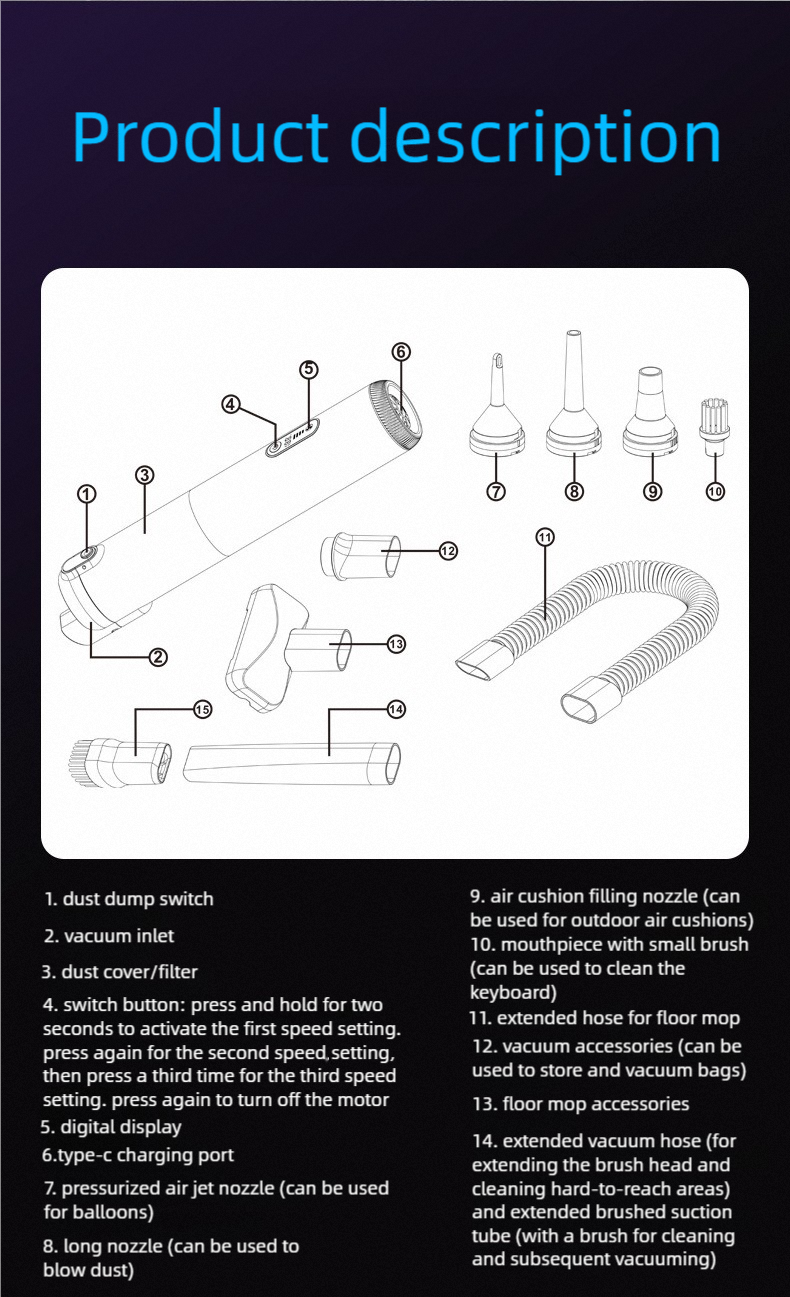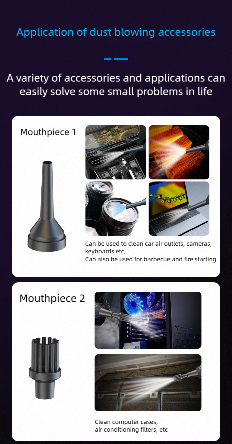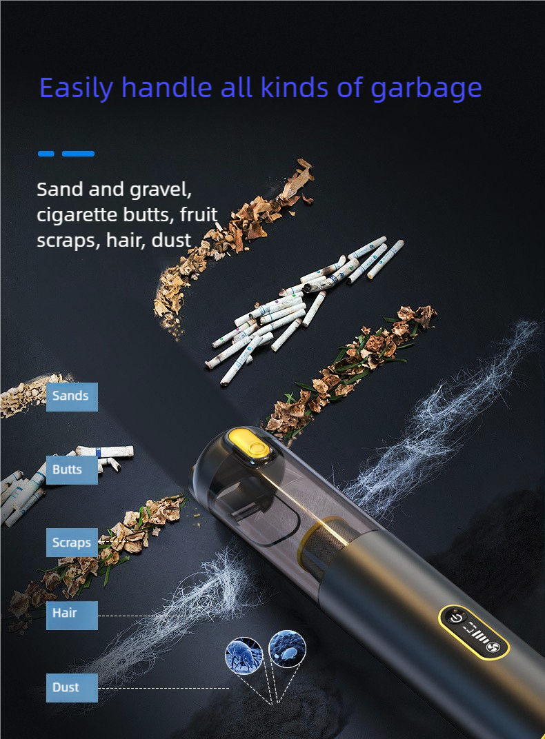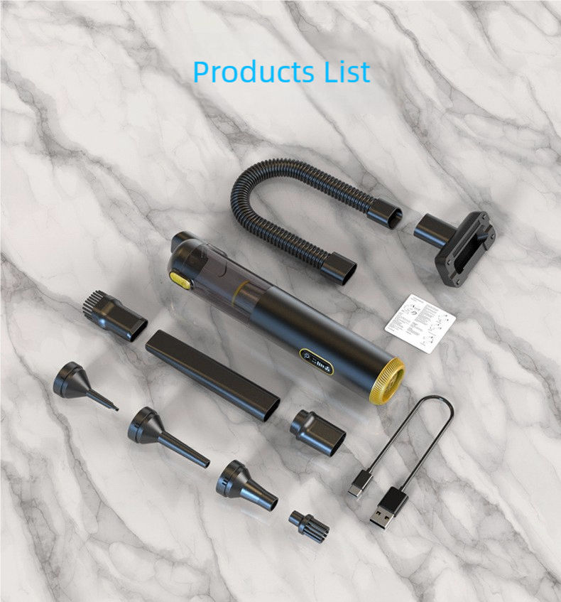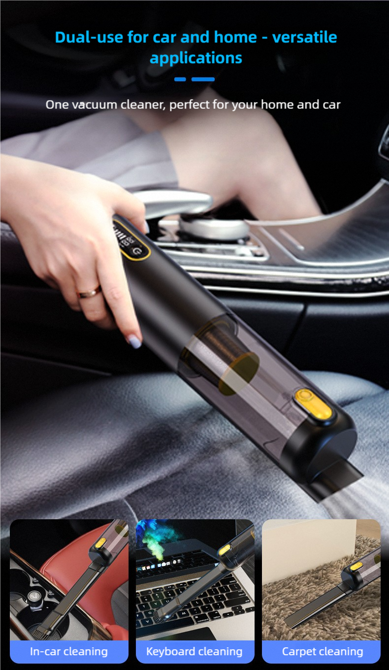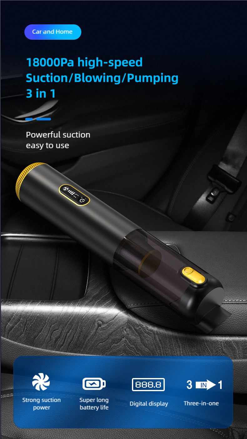 Powerful 3-in-1 Handheld Vacuum for Car and Home Meet the ultimate portable cleaning solution. This sleek, handheld device combines powerful 18,000Pa high-speed suction with blowing and pumping functions, making it a versatile 3-in-1 tool for both your car and home. Key Features: Strong Suction Power: Effortlessly picks up dirt, dust, and debris from car seats, home furniture, and tight spaces. 3-in-1 Functionality: Functions as a vacuum, blower, and pump for maximum utility. Super Long Battery Life: Designed for extended cleaning sessions without frequent recharging. User-Friendly Digital Display: The clear digital screen (e.g., 888.8) provides essential status updates at a glance. Easy to Use: Engineered for simplicity with intuitive controls, highlighted by a stylish matte black and gold finish. Compact and powerful, it's designed to make cleaning quick, easy, and efficient.